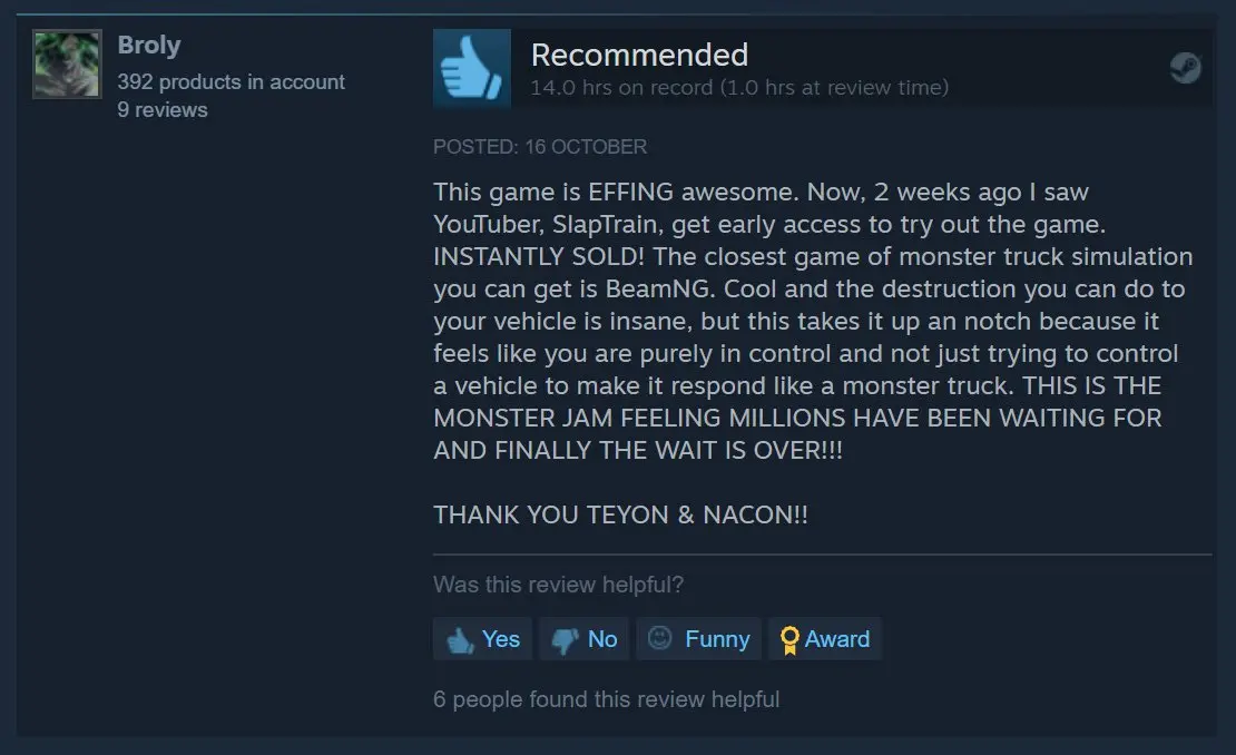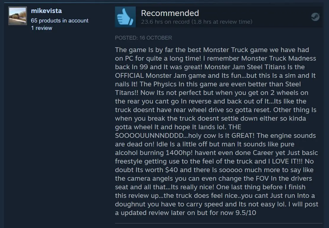 „Monster Truck Championship to wierna symulacja, która oferuje satysfakcjonującą krzywą uczenia się i świetne poczucie spełnienia. Zawody mogą stać się trudniejsze, ale masz wiele opcji, aby ulepszyć swojego monster trucka."